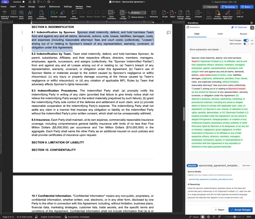 ArenaDocs operates directly within that environment. Drafting tools, redlining suggestions, clause generation, and document review all sit inside the document itself, rather than requiring users to move between platforms.