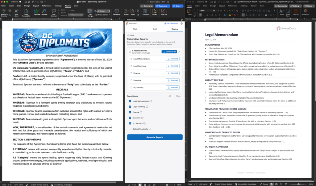 Kevin: “Internal communication at the speed of AI is already happening within lots of legal teams and the sports industry is no exception. Features like our tailored Stakeholder Reports allow the legal team to automatically draft reports that translate the documents into correct language and context for a specific audience. The way we’ve seen this used in practice with our customers is to attach our executive summary or legal memorandum as a cover sheet when sending documents up the chain and using our department specific reports as an organized notification of the relevant details when informing internal departments of the implications on their department from the deal. With the legal process streamlined and the internal communication friction removed, we expect that teams will be able to navigate deals much more efficiently and, therefore, increase their volume of deals considerably.”