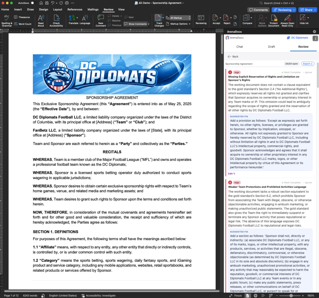 Kaelin Brittin’s background helps explain why the product takes that approach. Before co-founding ArenaDocs, she worked as Associate Counsel for the Washington Commanders, where legal work sat close to some of the organisation’s most visible moments: the sale of the franchise, the name change, major commercial agreements, and the constant negotiation of sponsorship, licensing, and vendor terms. ArenaDocs reads very much like a product built from that vantage point.