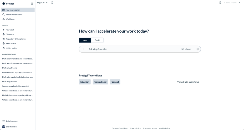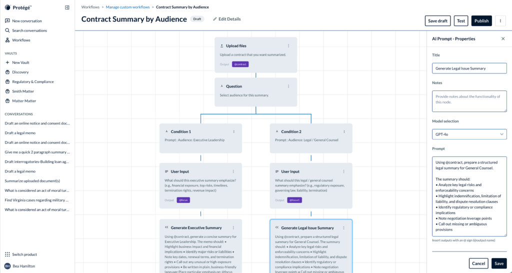 - A no-code Custom Workflow Builder that allows law firms and corporate legal departments to design, test, and share multi-step workflows tailored to their own standards and playbooks, turning institutional knowledge into repeatable legal processes that can be used consistently across teams.