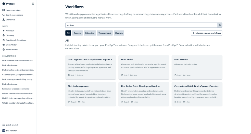 - Pre-built, configurable workflows that can be run as-is or adapted to firm and department standards, including litigation workflows, transactional workflows, and everyday legal workflows for broader AI tasks via LexisNexis-enhanced general AI models from Anthropic, Google, and OpenAI. Examples include drafting a motion to dismiss; generating full discovery and deposition documents; creating transactional documents or clauses; redlining agreements against internal standards; analyzing key provisions and identifying high-risk clauses; comparing similar arguments or laws; and summarizing interviews.