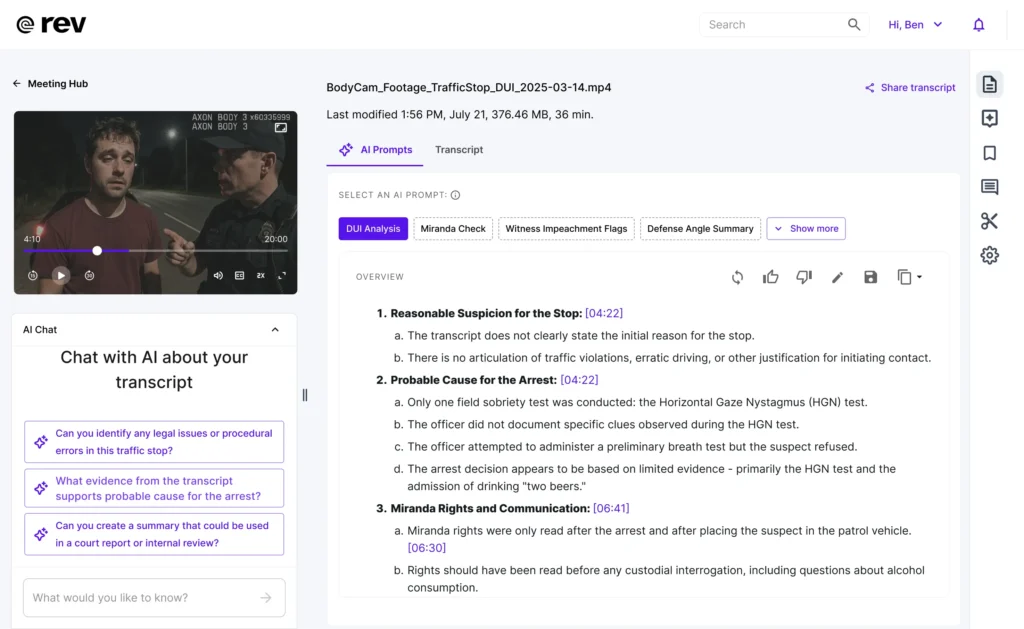 Jason: “Our path into legal AI was a natural progression of what we’d already been doing for years. Rev started as a trusted platform for journalists and researchers committed to uncovering the truth. Over time, lawyers and investigators began finding us on their own — using our transcripts to analyze body-came footage or jail calls, to identify contradictions, and ultimately to strengthen their cases.