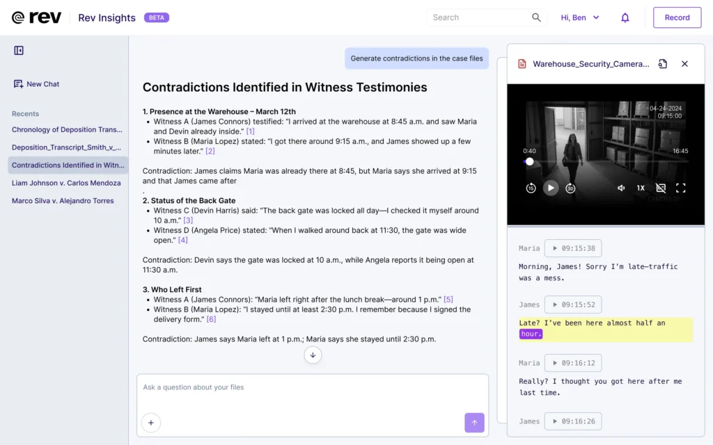 We’ve seen investigators use Rev to cross-reference witness statements across multiple cases, journalists use it to trace patterns of misconduct, and attorneys use it to prepare for trial faster than ever. Those workflows remind us that Rev’s purpose hasn’t changed — we’re still helping people surface truth efficiently, whether they’re in a newsroom or a courtroom.”